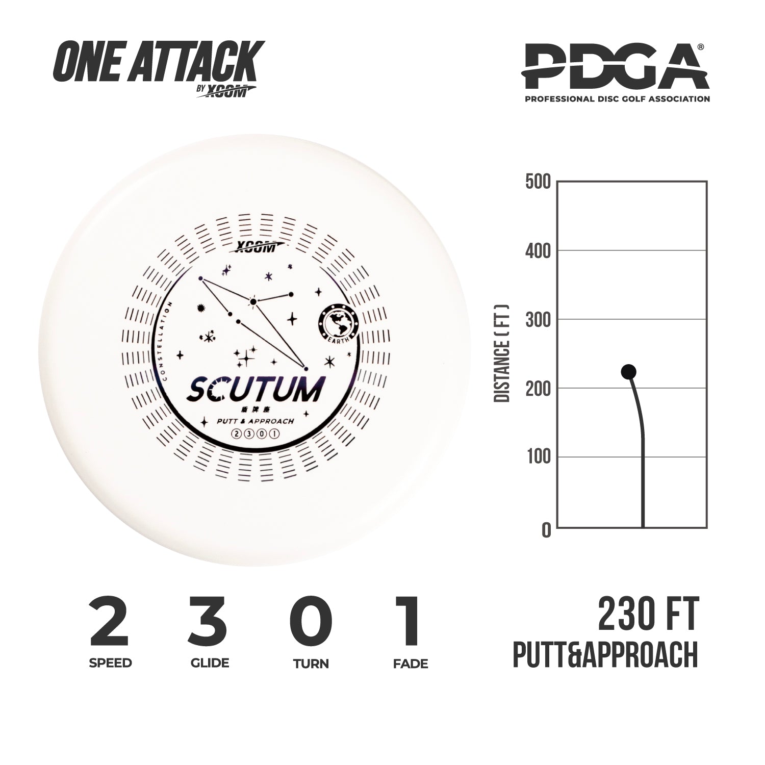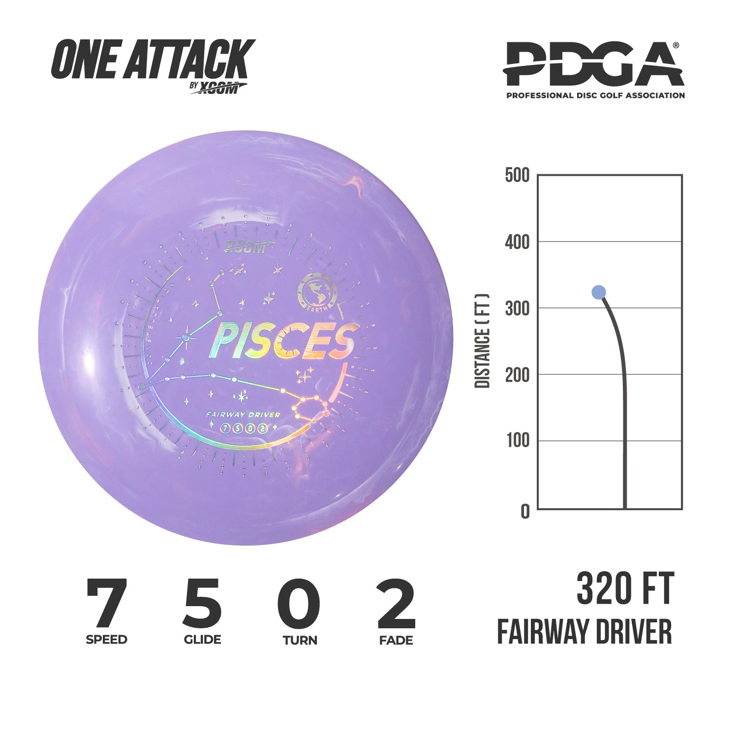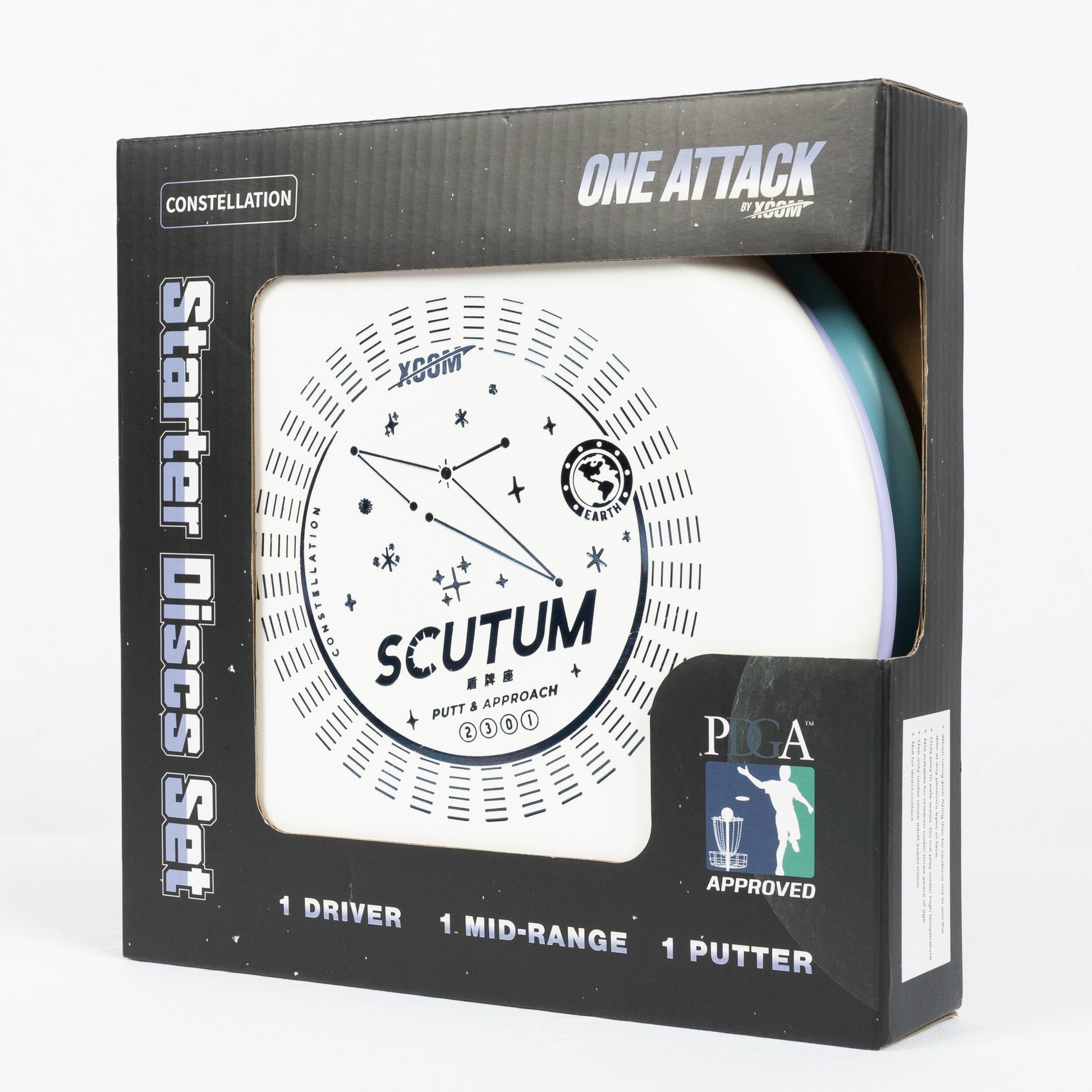 - ABOUT THE DISCS - The ONE ATTACK Disc golf beginner set has 3 different discs. The PISCES, a stable fairway driver with ratings of 7 | 5 | 0 | 2. The AQU, a stable midrange with ratings of 5 | 4 | 0 | 3. The SCUTUM, a stable putter with the ratings 2 | 3 | 0 | 1